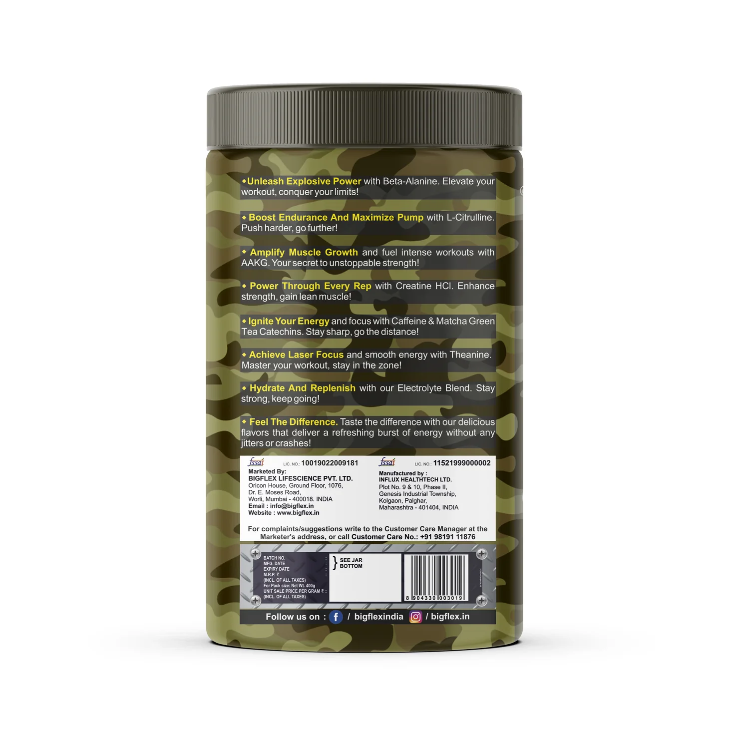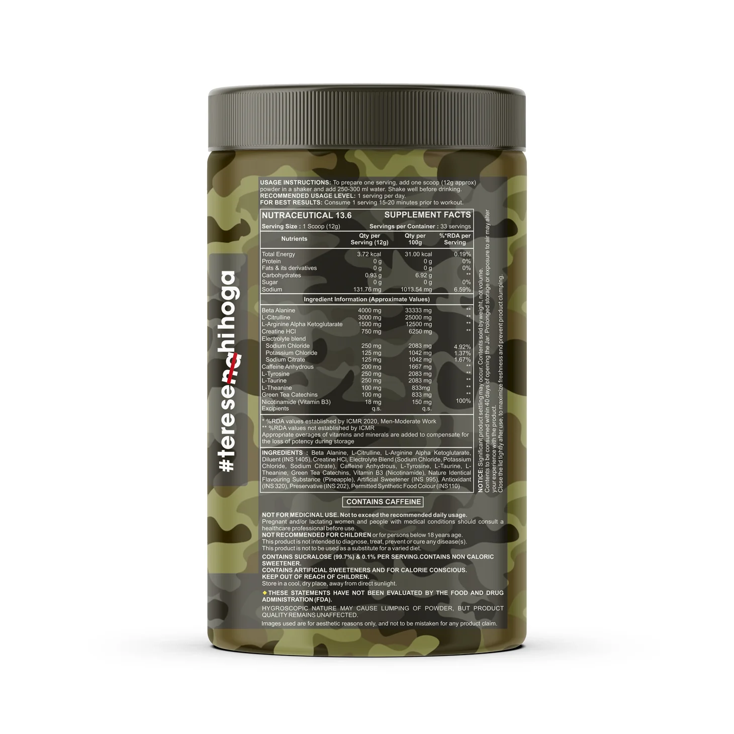 Mix 12g with water, shake well, and consume pre-workout.