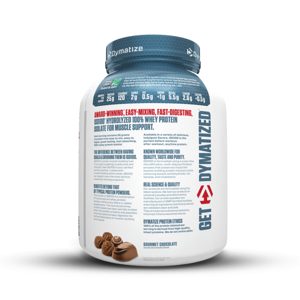 Dymatize ISO100 Gourmet Chocolate is a trusted source of ultra-pure whey protein isolate to fuel muscle recovery, support efficient lean mass gains, and satisfy your taste buds.