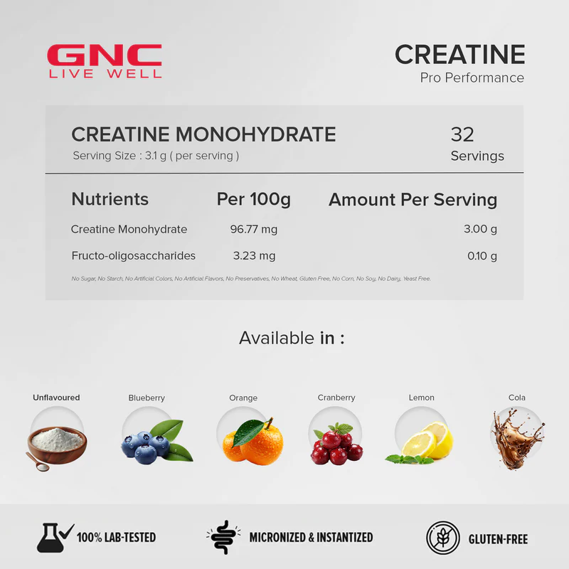 GNC Pro Performance Creatine Monohydrate 3000mg provides trusted power, stamina, and rapid recovery for top-level results in any strength or endurance routine.