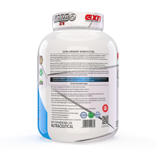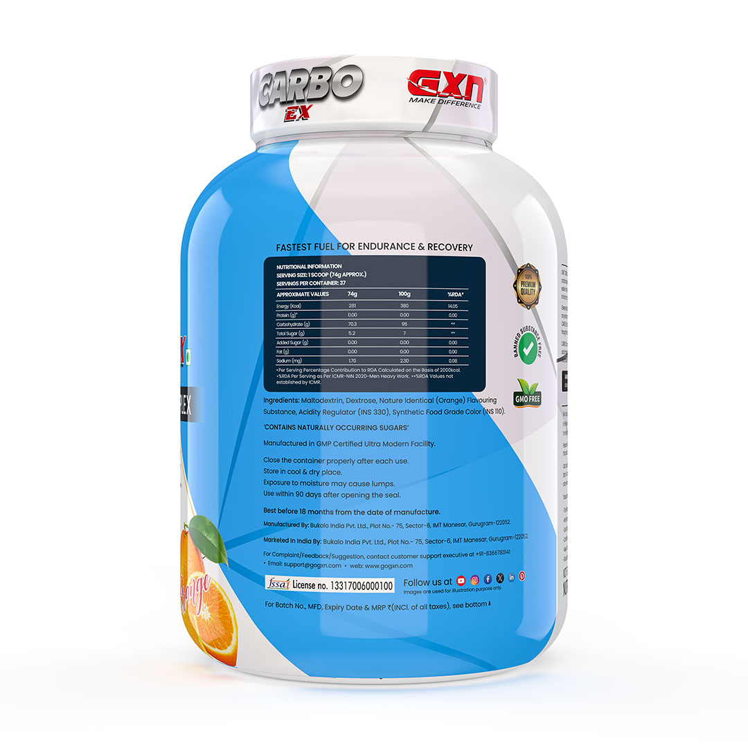 GXN Carbo Ex is a high-quality, fast-absorbing complex carbohydrate supplement designed to fuel energy, support mass gain, and enhance endurance for athletes and fitness enthusiasts. Each serving delivers 70.3g of carbs and 281 kcal energy, making it ideal for rapid glycogen replenishment, muscle recovery, and pre- or post-workout performance. With zero sugar and zero fat, GXN Carbo Ex offers a clean calorie source for people aiming to bulk up while supporting sustained energy without crash or unwanted fat gain.