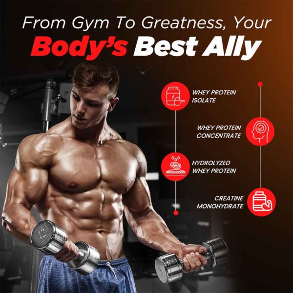 GXN Nitra Whey is a scientifically engineered whey protein supplement primarily composed of whey protein isolate, whey protein concentrate, and hydrolyzed whey protein. It features a powerful Strength Matrix including creatine monohydrate and taurine to enhance muscle strength, endurance, and recovery. The formula also includes a T-Boost blend with natural testosterone boosters such as Ashwagandha, Tribulus Terrestris, and Safed Musli. Enriched with rosehip extract and calcium, it supports joint health, while added digestive enzymes promote easy digestion and nutrient absorption. Available in Dutch Chocolate and American Ice-cream flavors, Nitra Whey offers high-quality protein and muscle-building support with excellent taste.