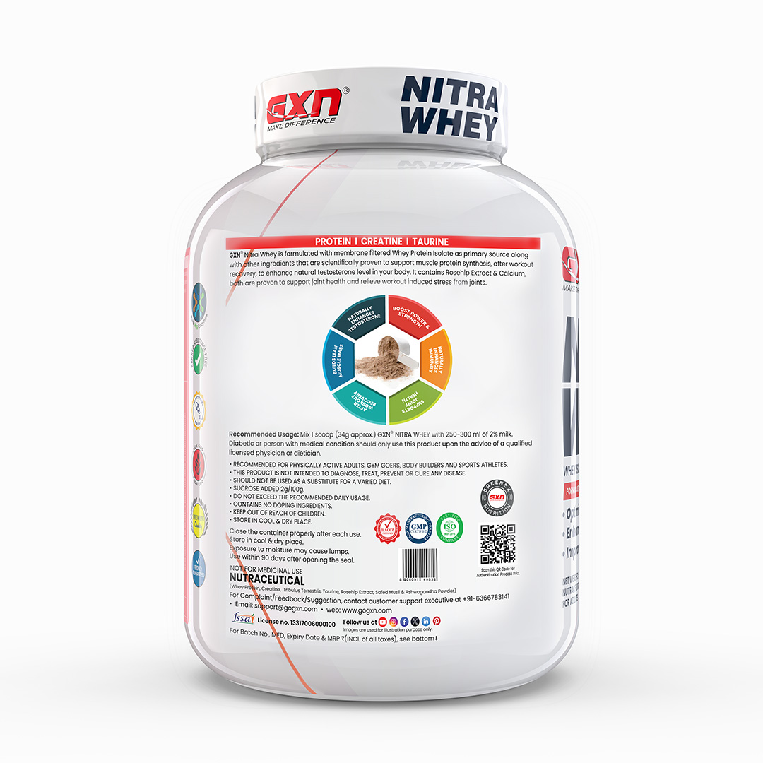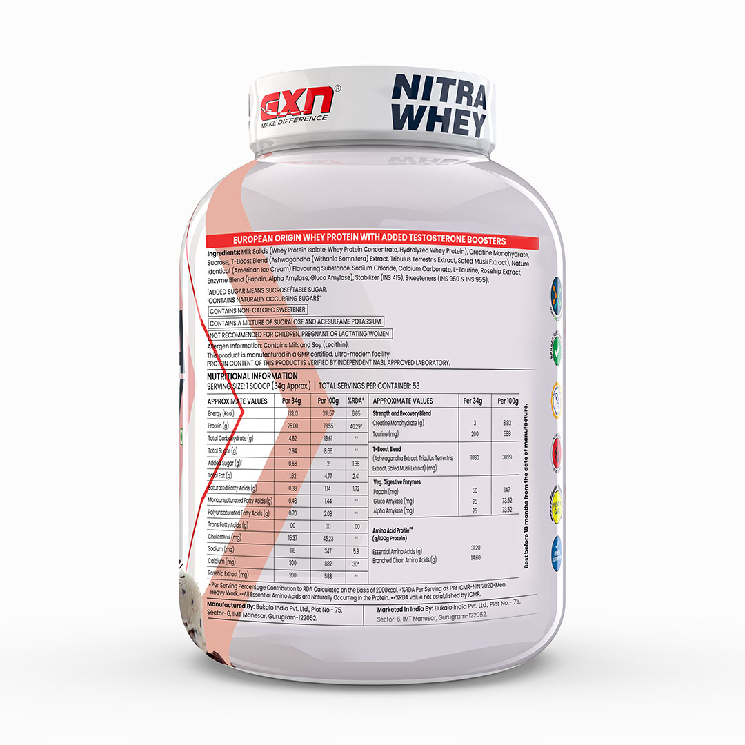 GXN Nitra Whey is a scientifically engineered whey protein supplement primarily composed of whey protein isolate, whey protein concentrate, and hydrolyzed whey protein. It features a powerful Strength Matrix including creatine monohydrate and taurine to enhance muscle strength, endurance, and recovery. The formula also includes a T-Boost blend with natural testosterone boosters such as Ashwagandha, Tribulus Terrestris, and Safed Musli. Enriched with rosehip extract and calcium, it supports joint health, while added digestive enzymes promote easy digestion and nutrient absorption. Available in Dutch Chocolate and American Ice-cream flavors, Nitra Whey offers high-quality protein and muscle-building support with excellent taste.