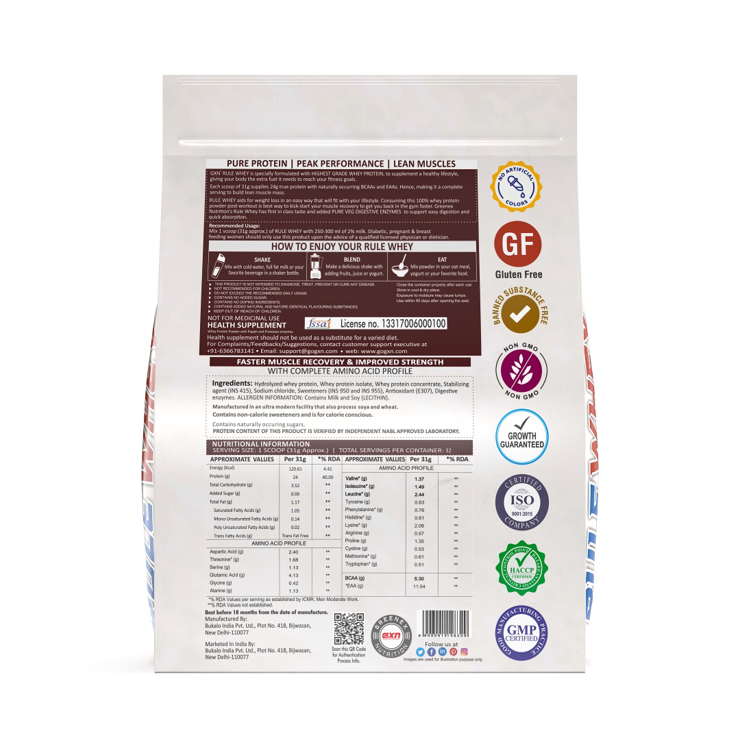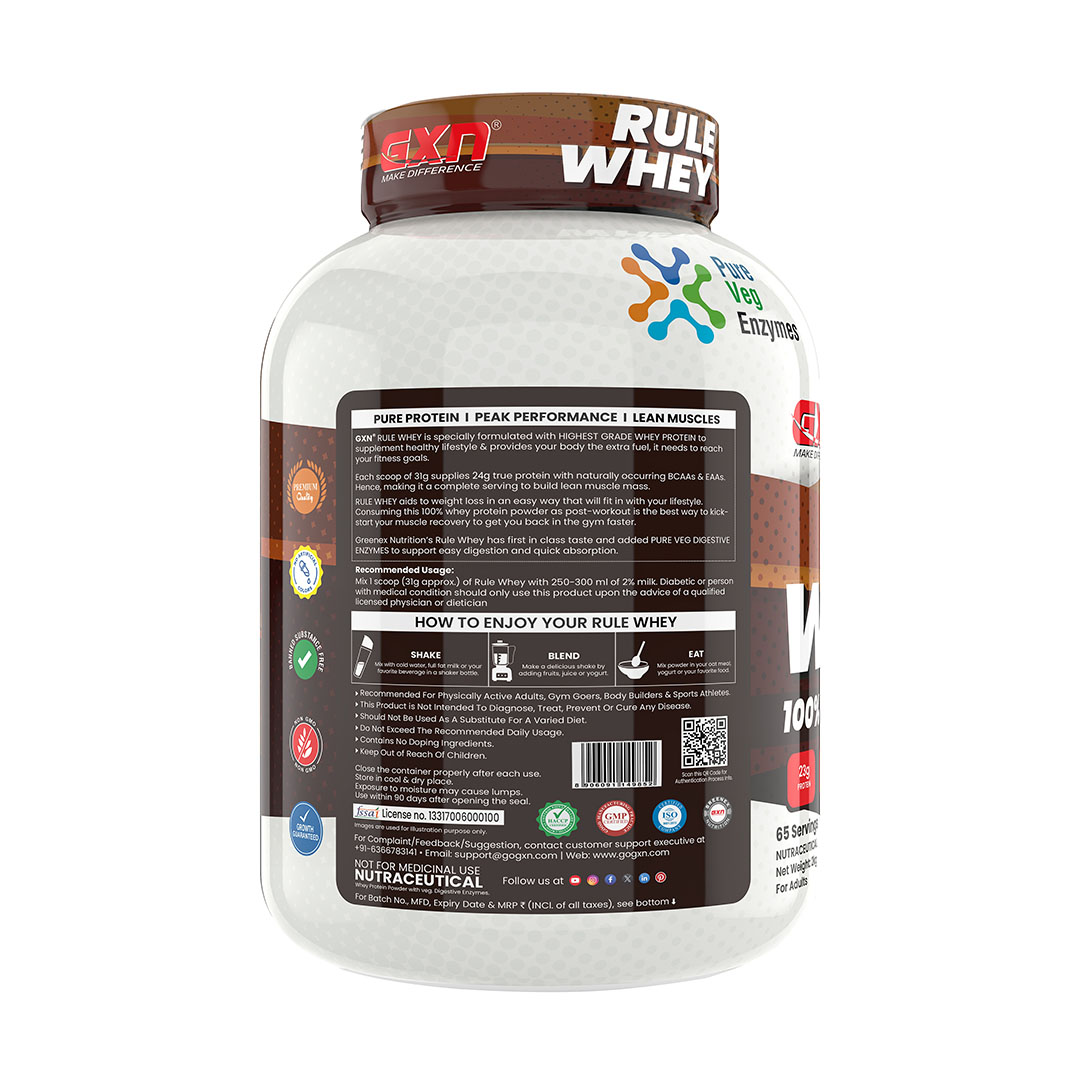 GXN Rule Whey is a versatile, effective whey protein supplement designed to fuel lean muscle growth, enhance recovery, and support overall athletic performance with excellent taste and digestibility.