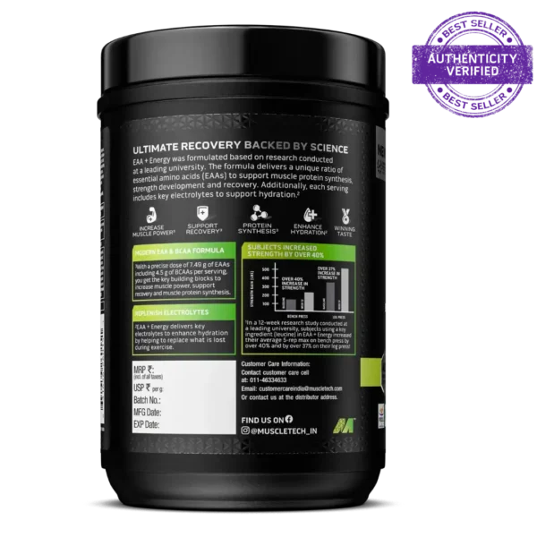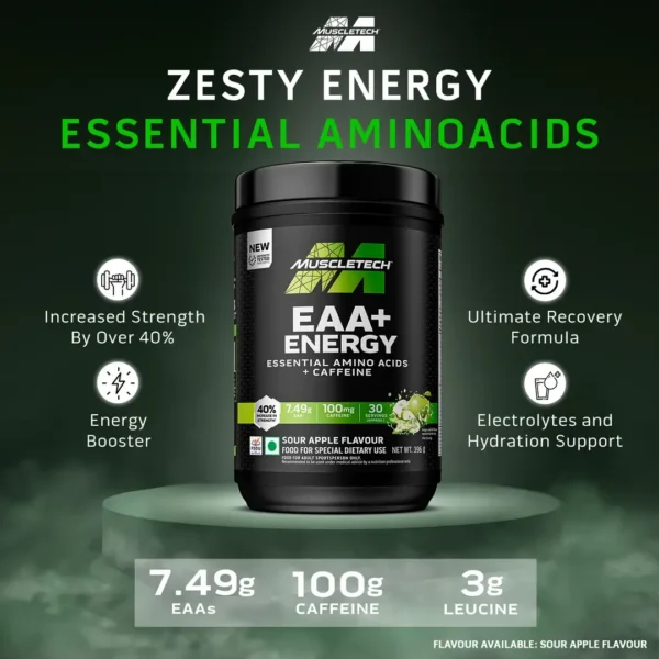 MUSCLETECH EAA ENERGY is a comprehensive amino acid and energy blend designed to enhance muscle performance, recovery, and focus for active individuals.​