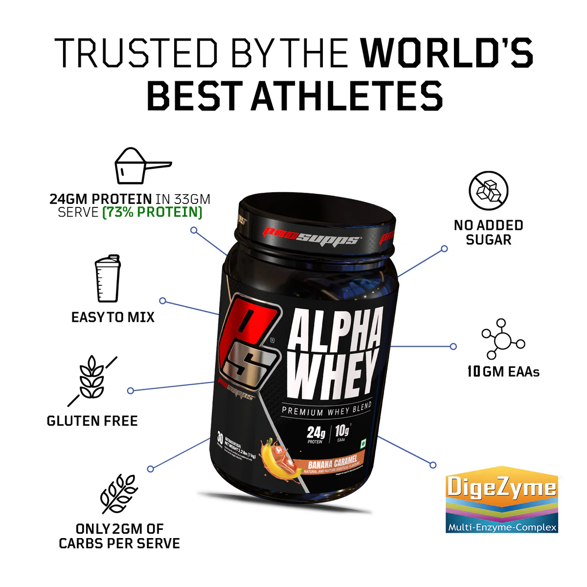 PS Alpha Whey Banana Caramel is a tasty and effective protein supplement ideal for athletes and fitness enthusiasts aiming to support muscle building and recovery with a delicious flavor option .