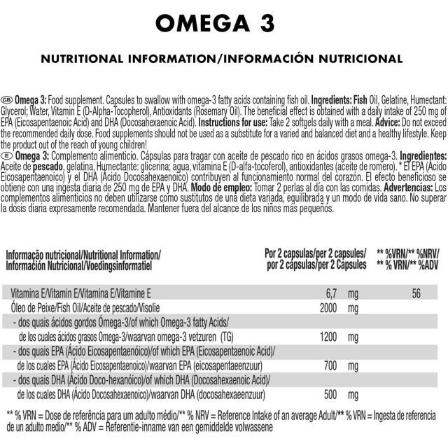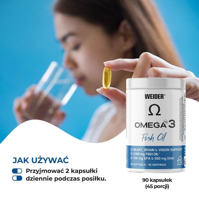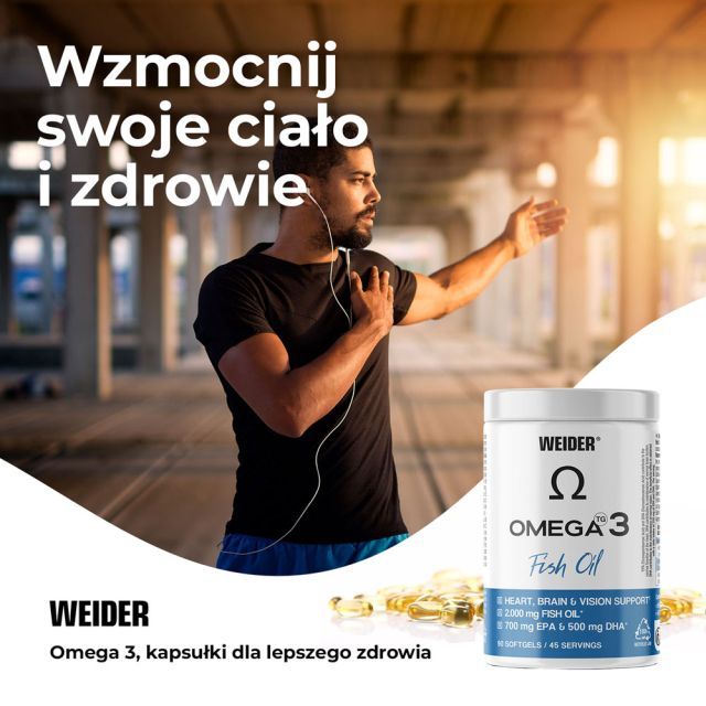 Weider Omega-3 Superior is a premium-quality fish oil supplement providing essential omega-3 fatty acids in triglyceride form for optimal absorption. Each softgel delivers 350 mg of EPA (eicosapentaenoic acid) and 250 mg of DHA (docosahexaenoic acid), along with vitamin E, a powerful antioxidant that protects cells from oxidative damage. Omega-3 fatty acids are essential nutrients that the body requires for proper functioning but cannot produce on its own; they are mainly found in oily fish and support cardiovascular, brain, eye, and immune health.